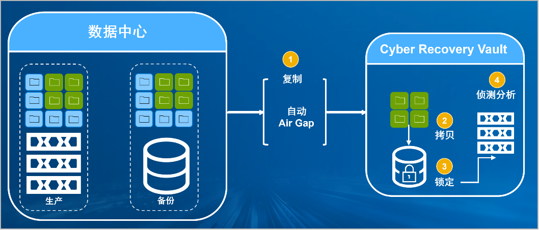 3044am永利集团防勒索病毒方案将生产中心备份数据复制到Vault区,复制后网络自动断开实现弹性隔离。Vault区的数据快速拷贝,并对拷贝版本加锁(在锁定期数据不允许删除和修改)。Vault沙箱内对拷贝版本进行扫描分析,验证数据是否完好。